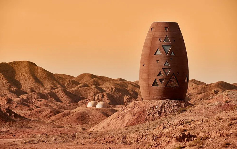 施工工藝:工廠預制打印+現場拼裝,房屋、庭院墻、屏風墻、雕塑、景觀、地磚等均采用3D打印方式建造